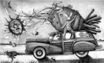 In any case, here’s a look at my finalist-winning entries for the internationally acclaimed Illustrators of the Future Contest. All three were done using drawing pencils–I believe B, 2B, and perhaps the occasional touch of 3B. “Musty” (from Musty Davenport in Purgatory) is the demon who visits Woodstock in my short story, “A Devil of a Time.” Tilting at Martians is an illustration for a comedic scifi novelette of the same name. And Attack of the Rabid 12ft Rutabaga is an illustartion for yet another of my still-looking-for-a-publisher novelettes: “Bunny’s Lucky Slipper.”